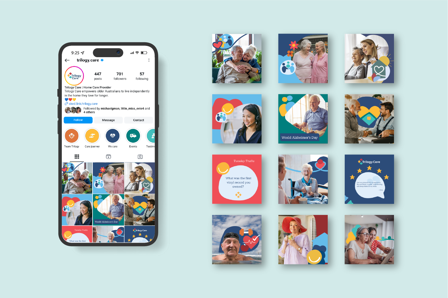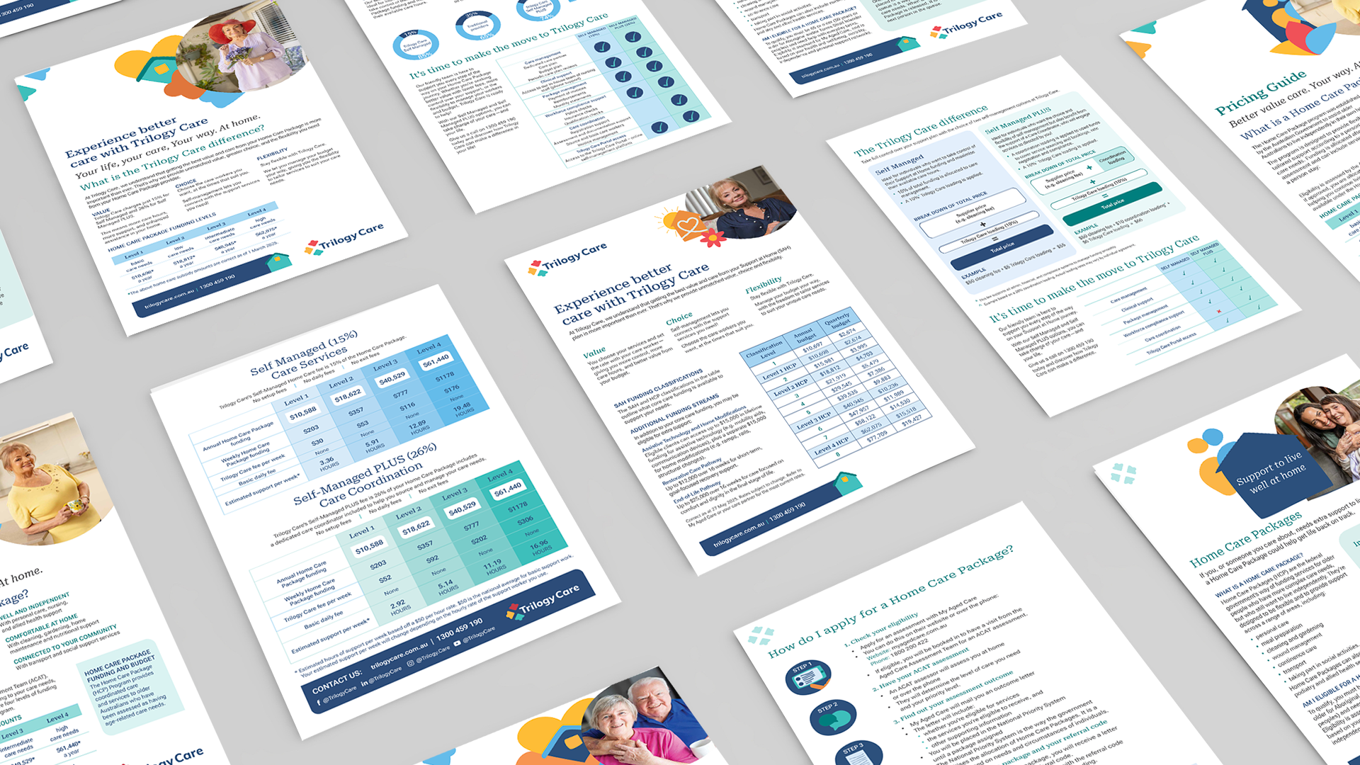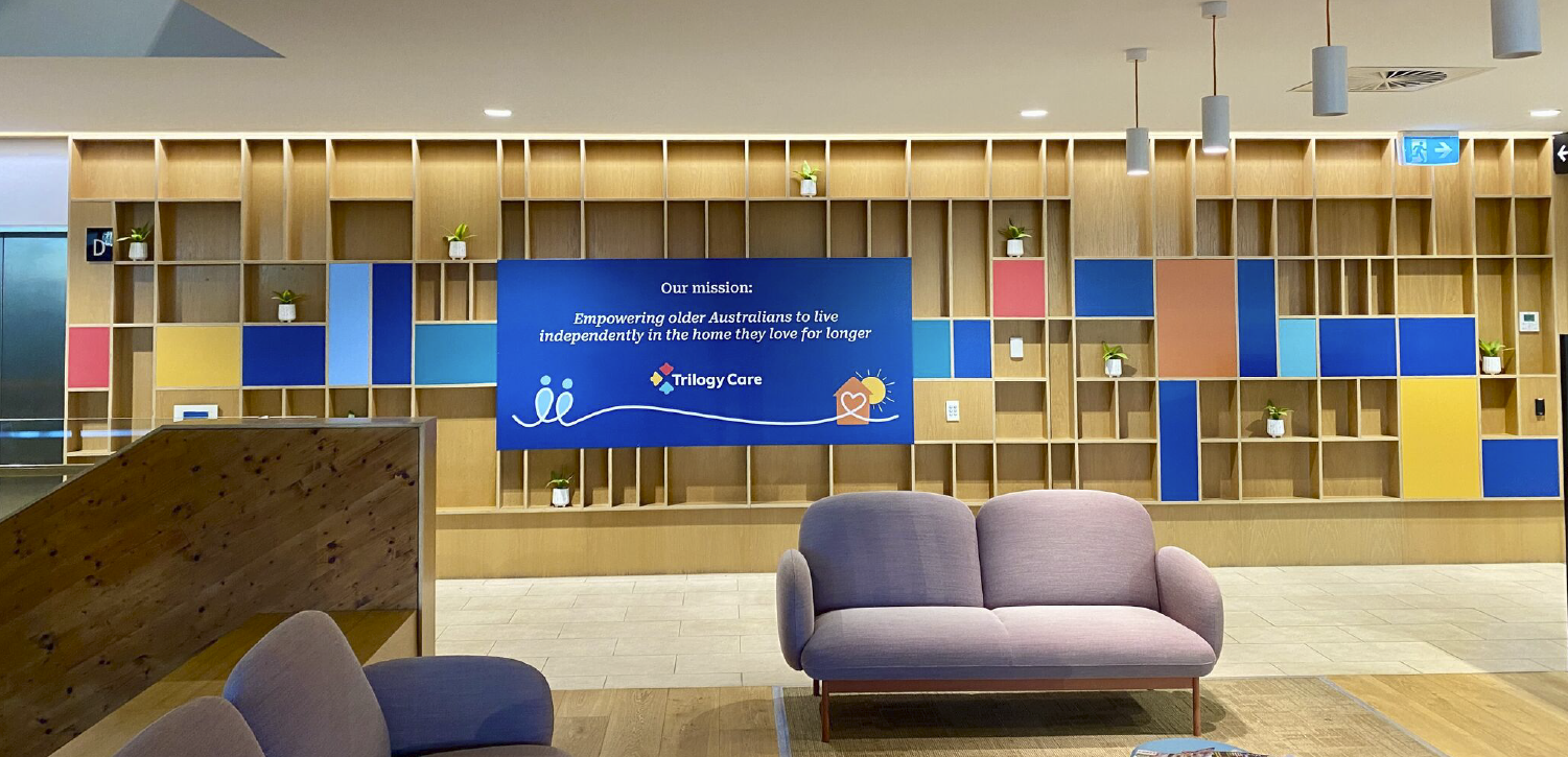 The new brand identity is built around a warm and approachable visual language. Support graphics are intentionally loose, organic, and slightly imperfect—steering away from overly modern or sterile aesthetics. This style creates a sense of comfort and relatability, especially important for Trilogy Care’s core audience: older Australians navigating a technology-driven world.